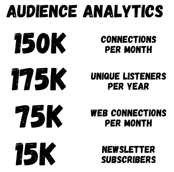 Furthermore, 76% of radio listeners recall hearing a specific ad within a week (source: Radio Advertising Bureau), demonstrating the medium's effectiveness in building brand awareness and driving consumer action. With its affordability, flexibility, and high engagement rates, radio advertising offers exceptional ROI, making it an ideal choice for businesses looking to increase visibility and foster deeper connections with potential customers, benefitting from the rapport building of the presenters and their listeners. Many of our advertising clients and sponsors return year after year.