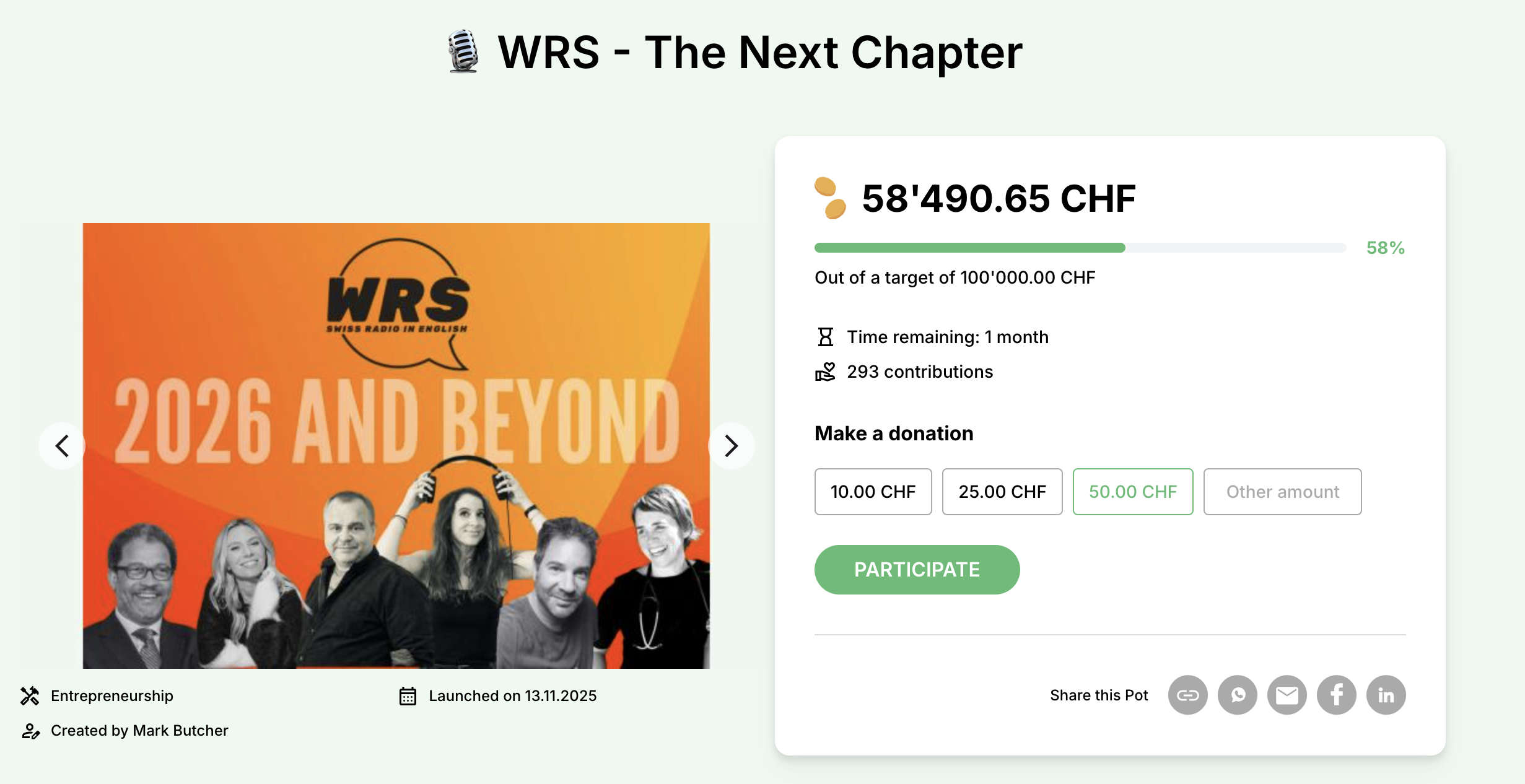 💳 CHF 25’000+ Join WRS history - leave your mark on English radio in Switzerland.
