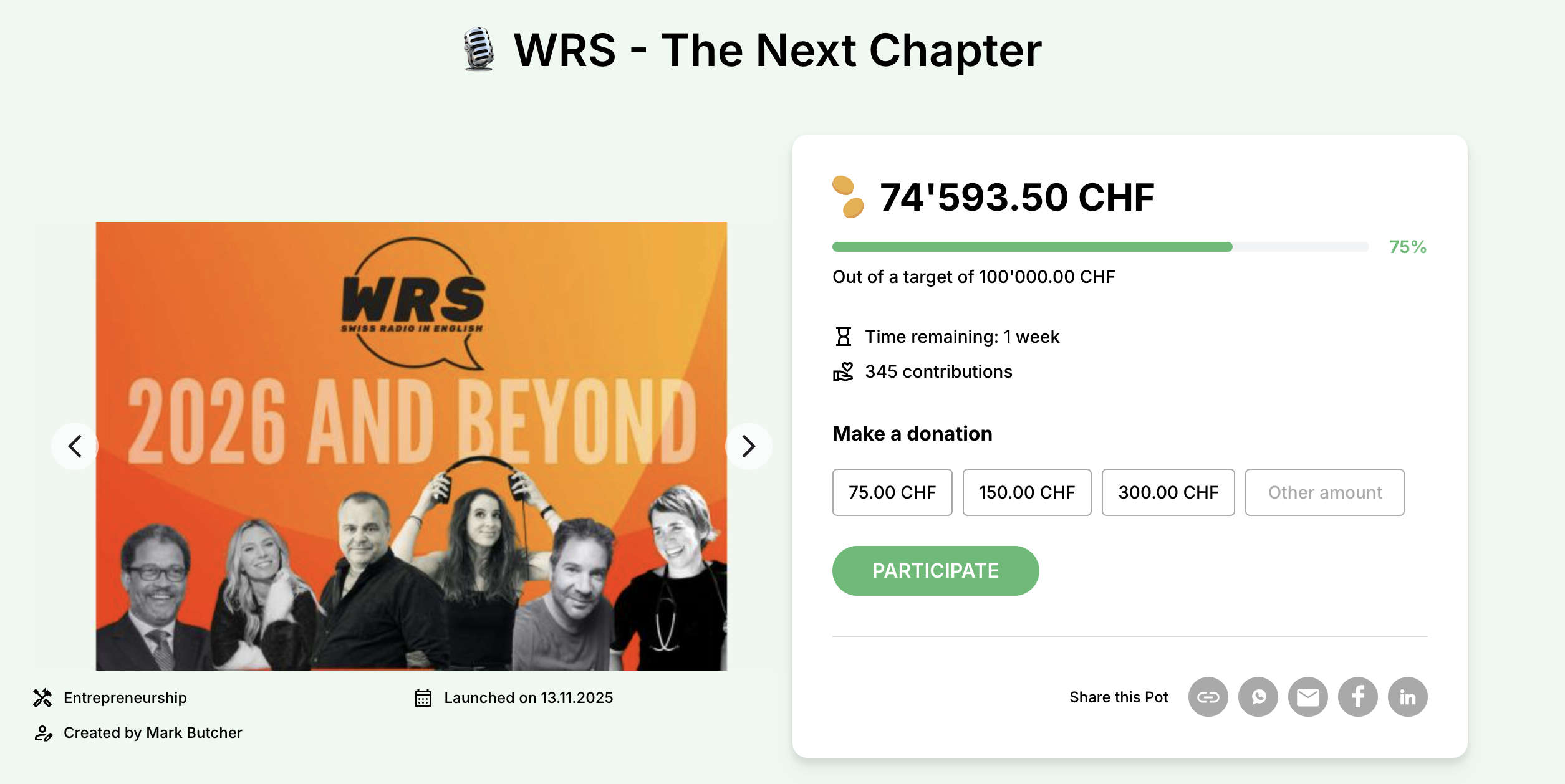 💳 CHF 25’000+ Join WRS history - leave your mark on English radio in Switzerland.